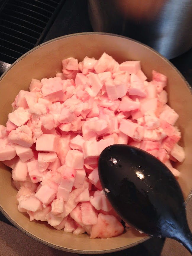 Wrap it up in plastic wrap and let it sit for half an hour. Mine sat for about 50 minutes, but I don't think that had a negative impact. Then take your dough ball and cut it into pieces about 1 cm wide.